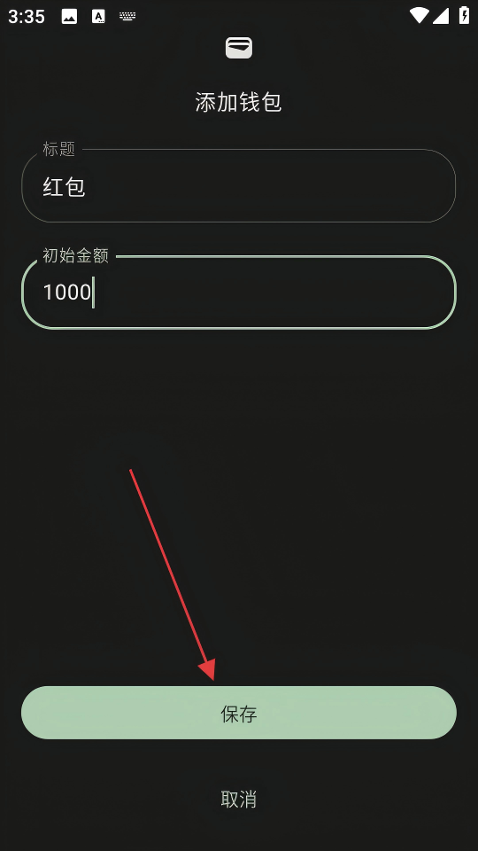 3、在“添加钱包”页面,填写标题为“红包”,初始金额为1000元,点击【保存】按钮。