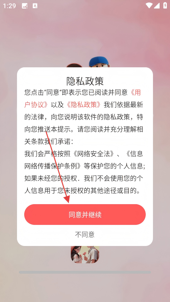 1、在“隐私政策”弹窗中,点击【同意并继续】按钮,进入APP主界面。