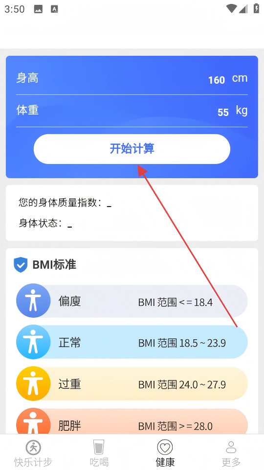 3、在“健康”页面,输入身高和体重后,点击【开始计算】按钮。