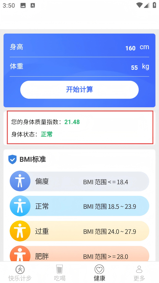 3、健康计算便捷:输入身高体重后一键计算BMI健康数值,帮助用户快速掌握自身身体指数健康状况。