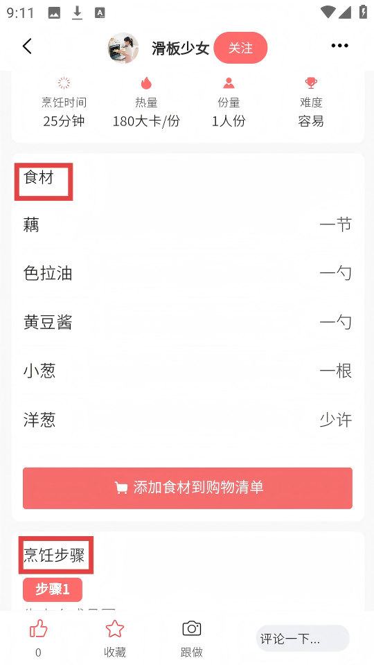 4、进入菜谱详情页后,可查看【食材】清单与【烹饪步骤】,还能添加食材到购物清单。