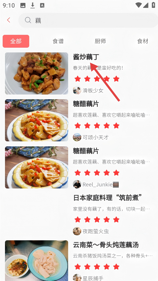 3、在搜索结果中,点击【酱炒藕丁】菜谱,进入详情页。