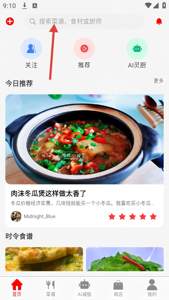 1、点击首页顶部【搜索菜谱、食材或厨师】的搜索框,准备输入内容。