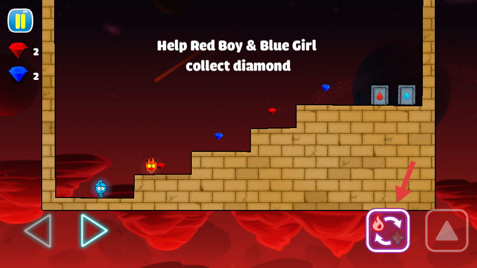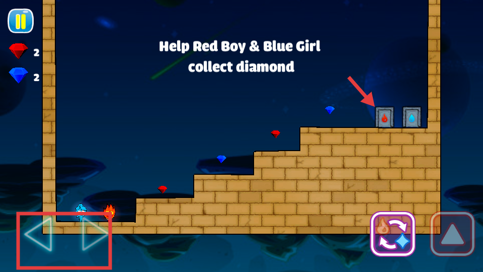 2、借助左侧方向按键操控角色移动,收集红、蓝钻石前往大门。