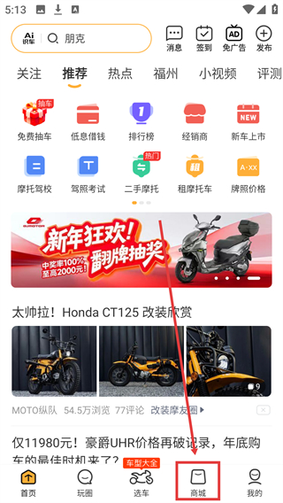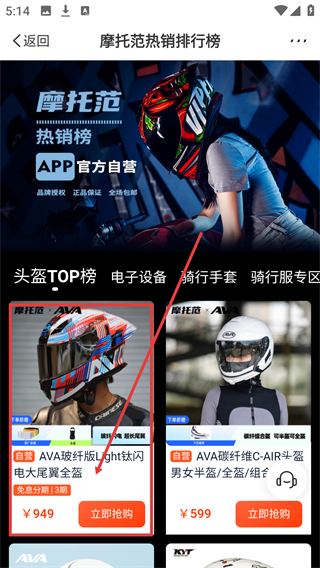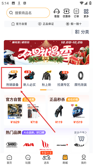 2、进入【商城】页面后,选择【热销装备】分类并点击,即可进入摩托范热销排行榜的商品列表界面。