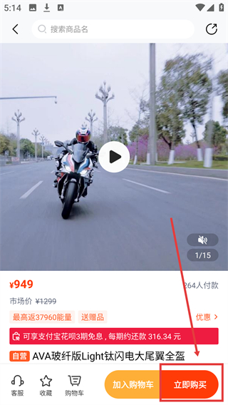4、在商品详情页,点击底部【立即购买】按钮,即可进入该头盔商品的下单购买流程。