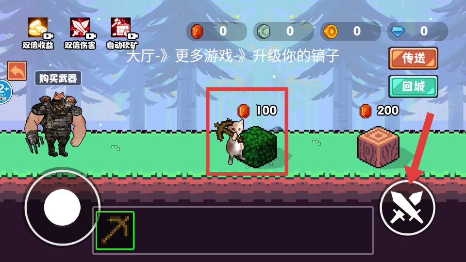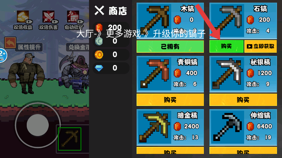 4、在商店界面中,选择如箭头所指的更高级【镐子】,点击【购买】按钮,提升挖矿和战斗能力。