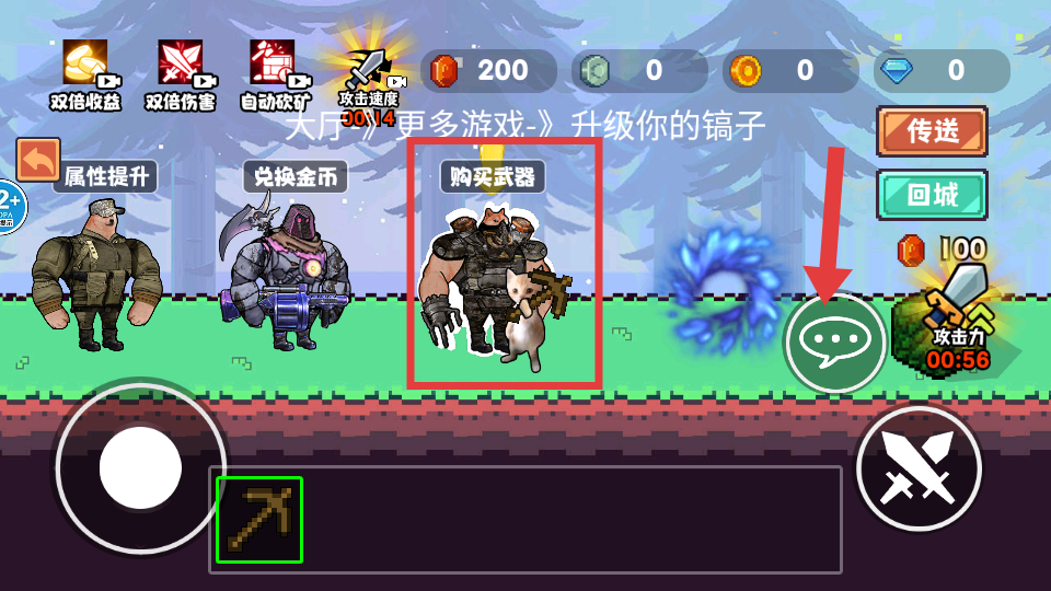 3、挖取足够铜币后,找到带有【购买武器】标识的角色,点击箭头所指的对话框按钮,进入武器购买界面。