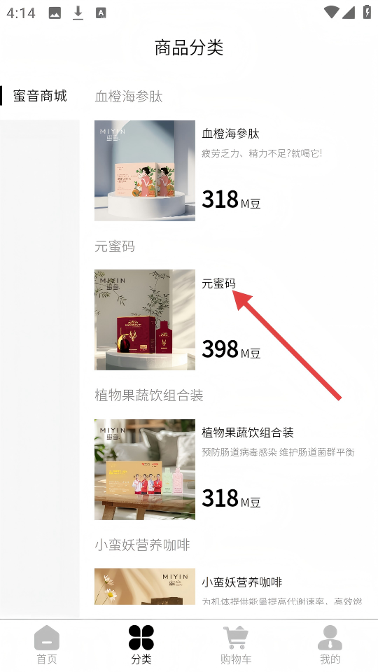 2、在商品分类页面,点击【元蜜码】商品,可进入该商品的详情页面。
