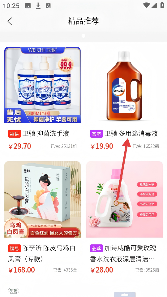 2、在精品推荐页面,点击【卫驰多用途消毒液】,进入该商品详情页。