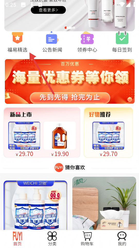 1、在首页点击【福易精选】,进入精选商品页面。
