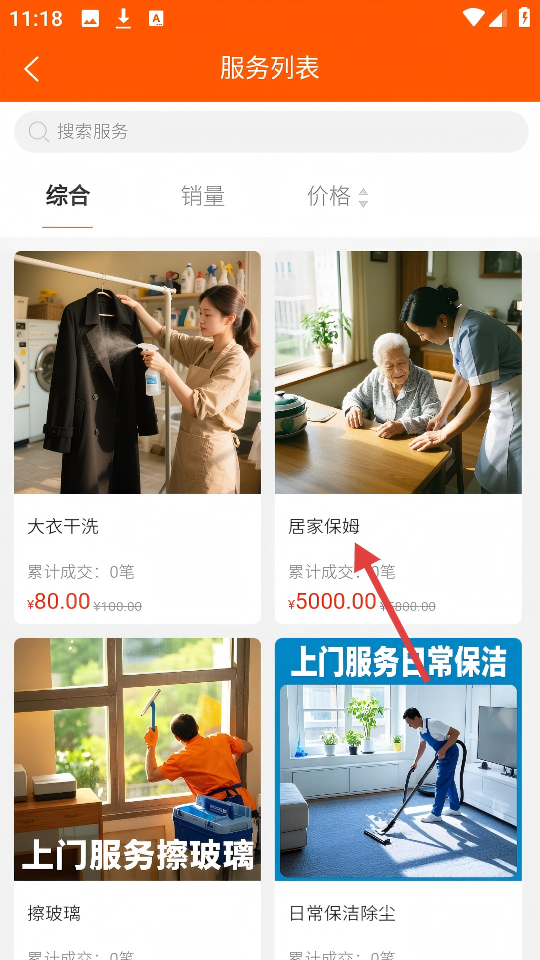 2、在【服务列表】页面,点击【居家保姆】服务项进入详情页。