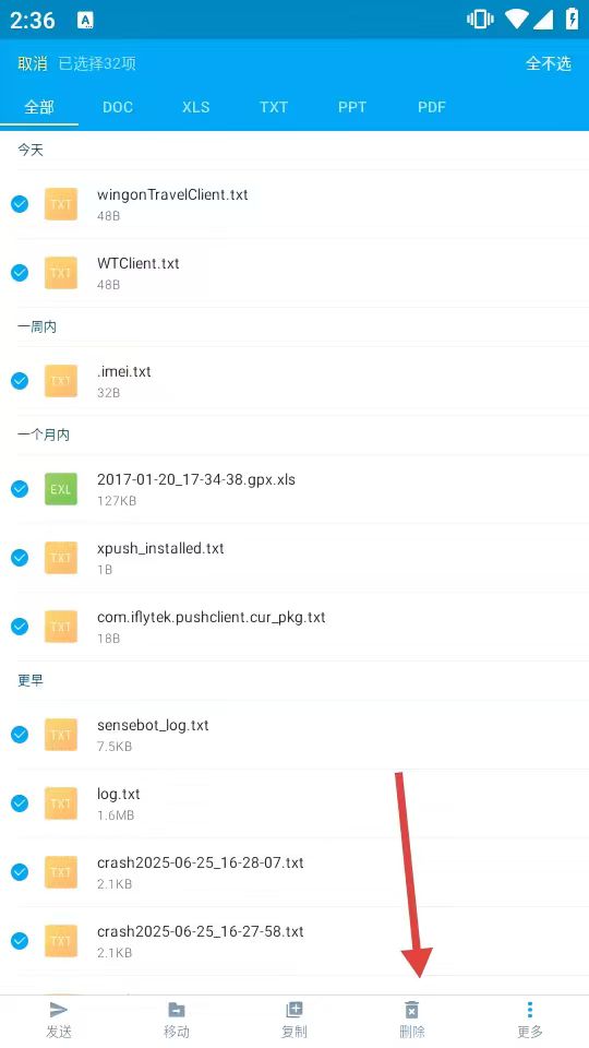 4、在文档选择状态下,勾选需要删除的文件后,点击底部【删除】,可删除所选文档。