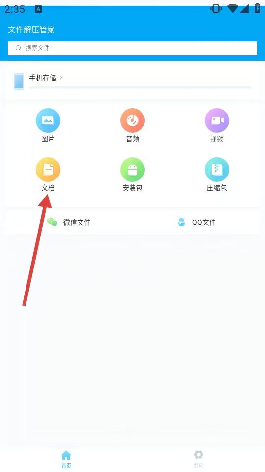 2、在文件解压管家主界面,点击【文档】,进入文档列表页面。