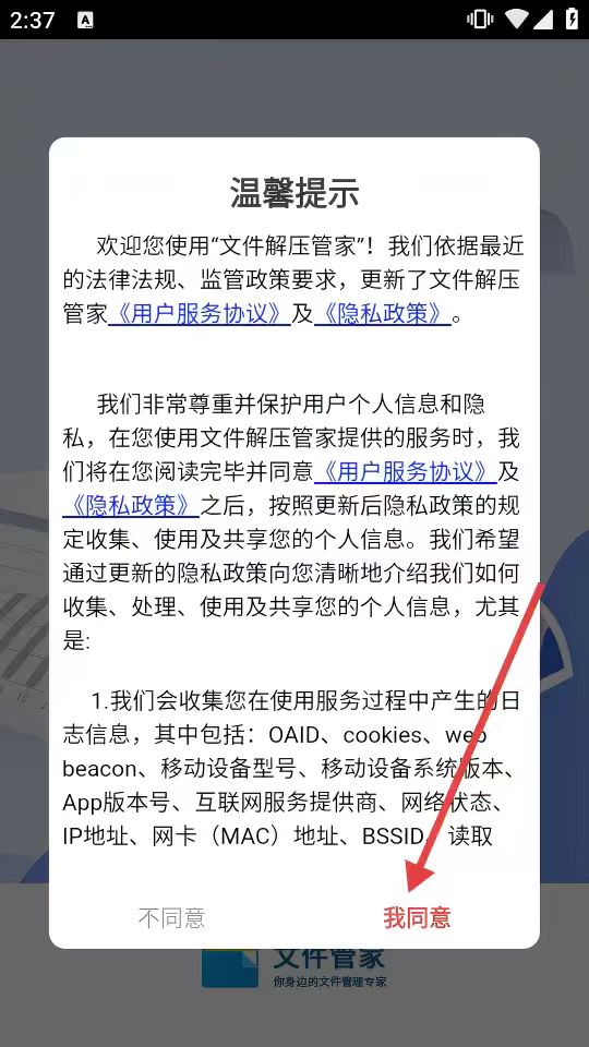 1、在温馨提示弹窗中,点击【我同意】,同意协议,进入文件解压管家主界面。