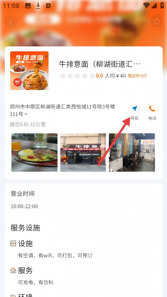4、在【牛排意面】的详情页面,点击【导航】按钮可获取到该商家的导航路线。