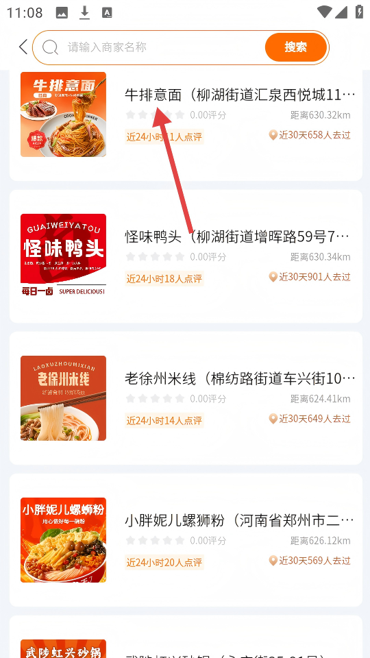 3、在商家列表页面,点击【牛排意面】可进入该商家的详情页面。
