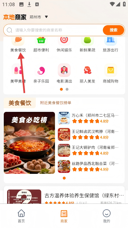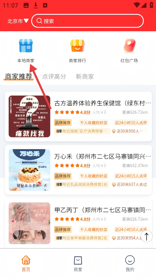 1、在首页,点击【本地商家】选项可进入本地商家页面。