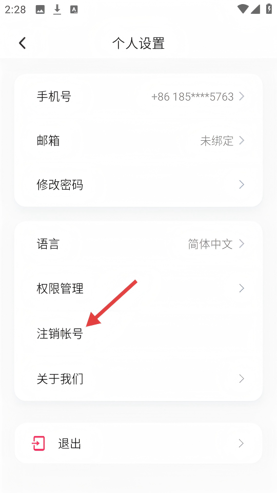 3、在【个人设置】页面,点击【注销帐号】选项。