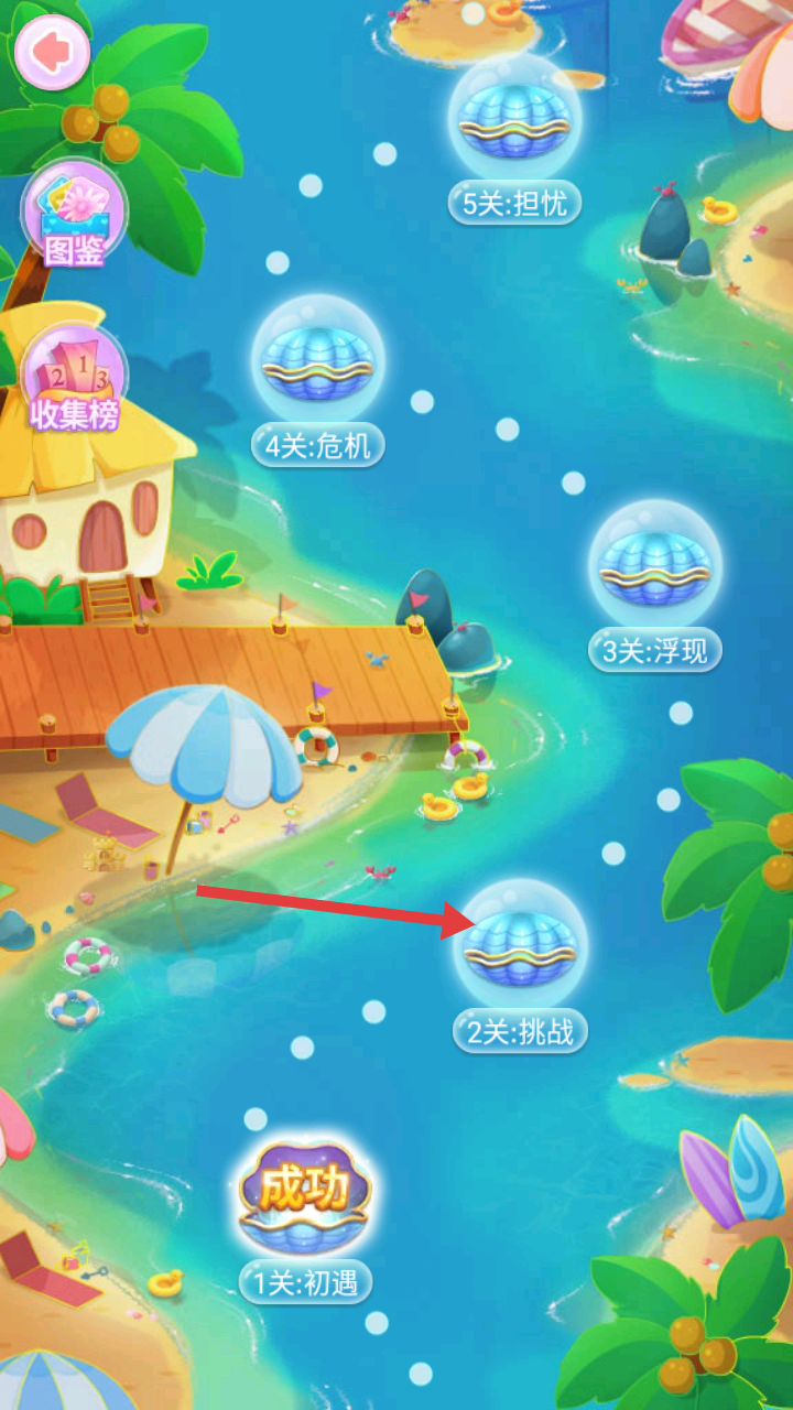 1、通关【1关-初遇】后,可按顺序挑战【2关-挑战】等后续关卡,左侧【图鉴】和【收集榜】也可留意。