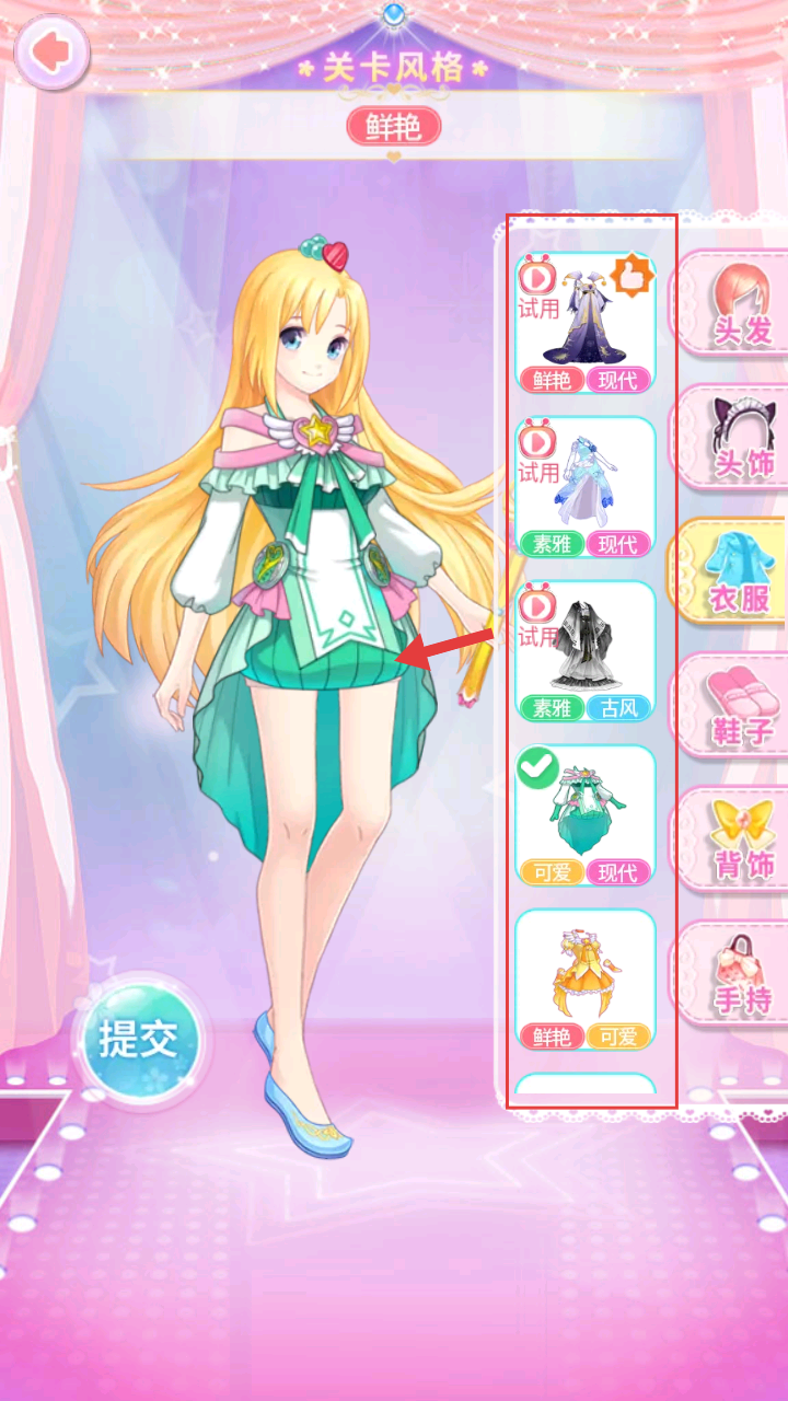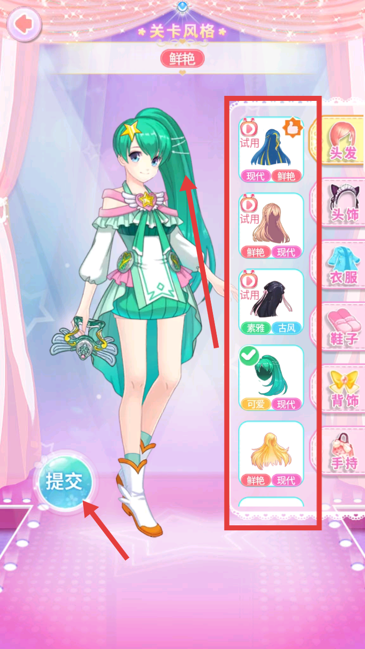 3、搭配好头发等装扮后,点击左下角【提交】按钮,即可提交当前搭配参与关卡。
