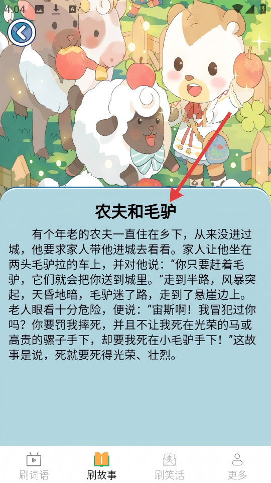 3、在【刷故事】页面,点击【农夫和毛驴】右侧的箭头,进入该故事的详情页面。