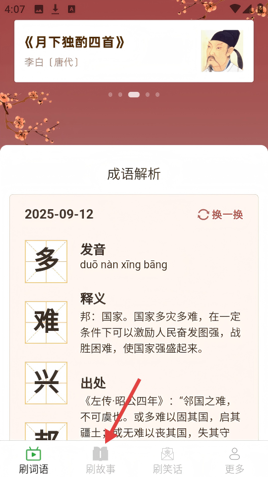 2、点击底部【刷故事】按钮,可查看包含成语解析等的内容。