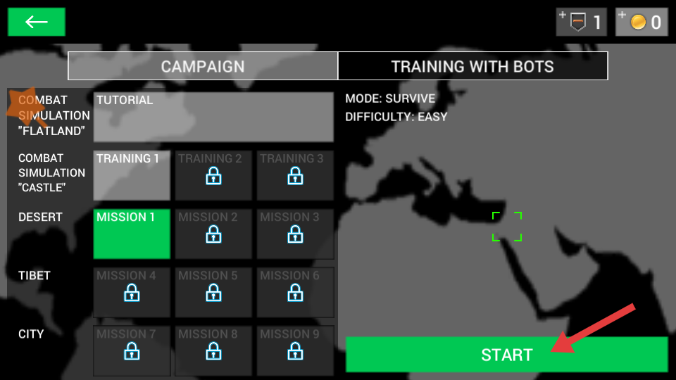 2、选择【MISSION1】,点击【START】,开始任务挑战。