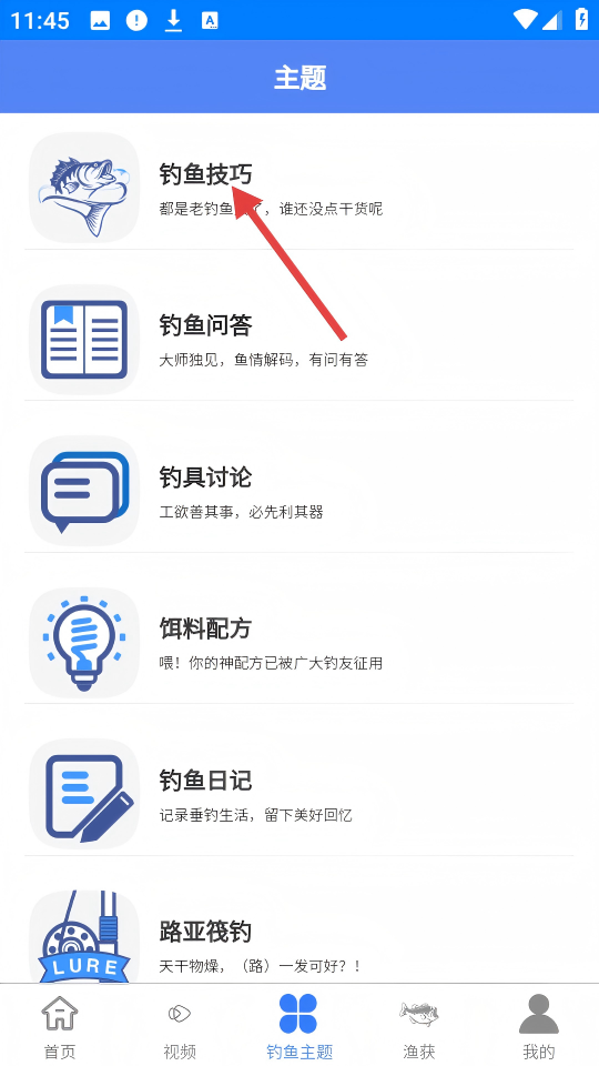 2、在【主题】页面,点击【钓鱼技巧】选项,可查看老钓手分享的钓鱼技巧内容。