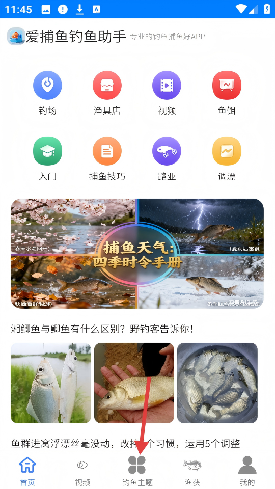 1、在应用首页,点击底部导航栏的【钓鱼主题】选项,进入主题页面。
