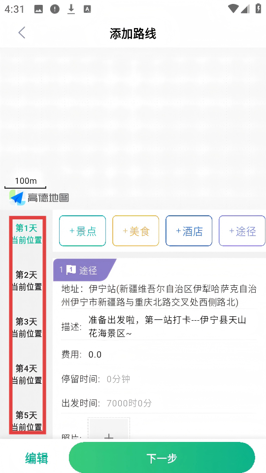 4、在添加路线页面,填写【第1天】到【第5天】的行程后,点击【下一步】。