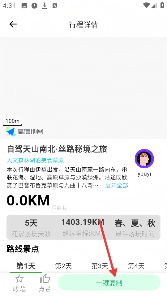 3、在行程详情页,点击右下角的【一键复制】按钮。