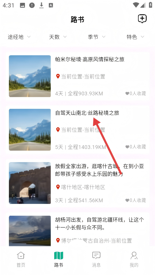 2、在路书列表中,点击【自驾天山南北・丝路秘境之旅】,进入行程详情页。