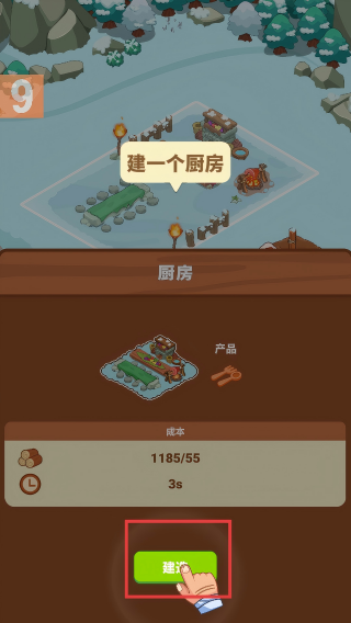 2、建造厨房,点击【建造】,获取厨房功能,为村民提供餐食保障。