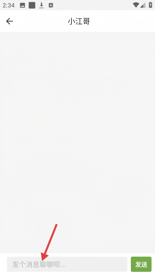 4、在与小江哥的聊天界面,点击底部【发个消息聊聊呗…】输入框,可输入消息后点击【发送】。