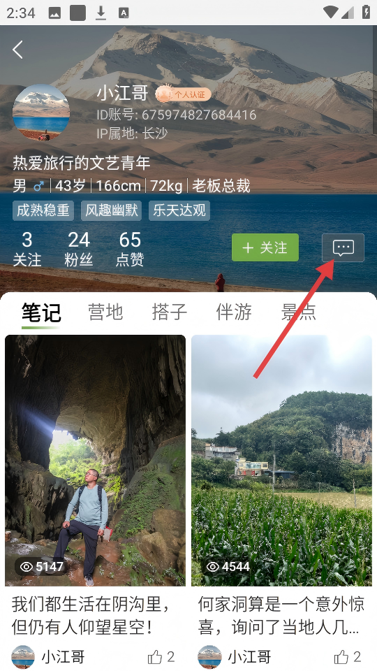 3、在小江哥的个人主页,点击聊天图标,进入与小江哥的聊天界面。