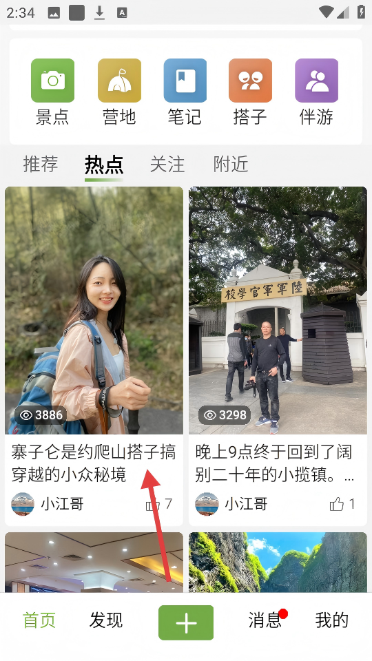 1、在发现页面,点击【寨子仑是约爬山搭子搞穿越的小众秘境】内容,进入该内容详情页。