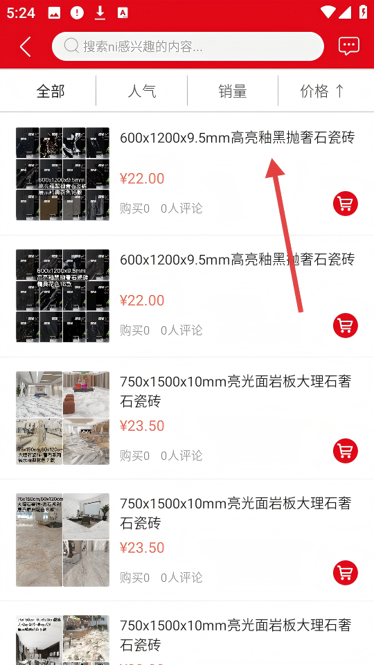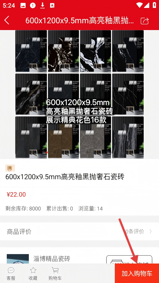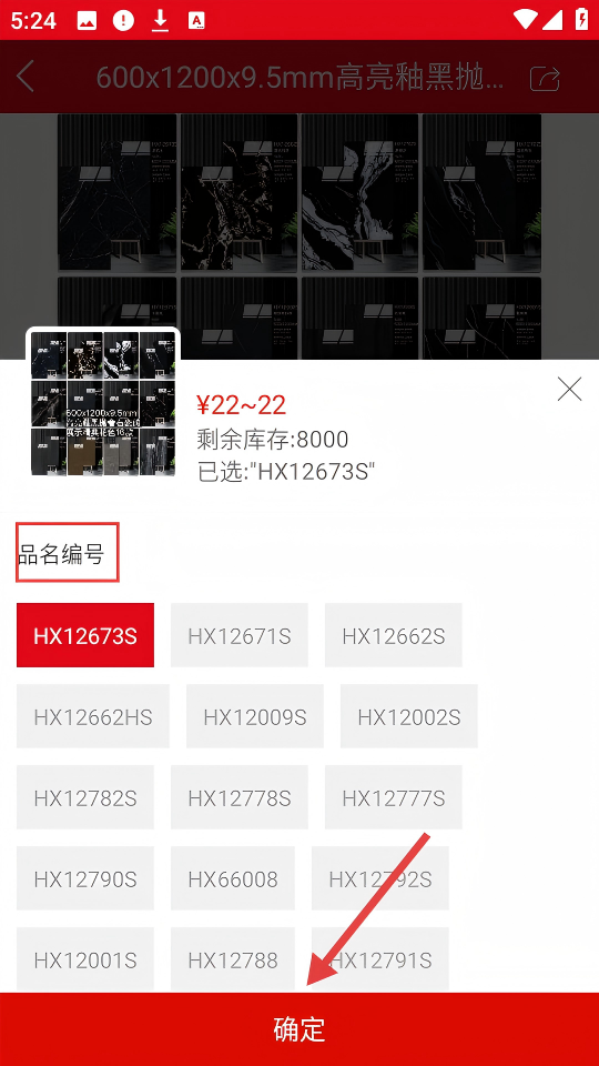2、在商品列表中,点击【600x1200x9.5mm高亮釉黑抛奢石瓷砖】,进入该商品详情页。