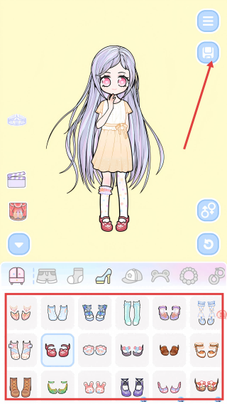 4、选择鞋子等配饰完善角色造型,全部搭配完成后,点击右上角保存图标,留存装扮成果。