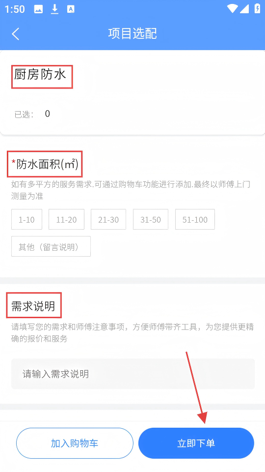 4、在项目选配页面,确认【厨房防水】项目,选择防水面积,填写需求说明,然后点击【立即下单】按钮。