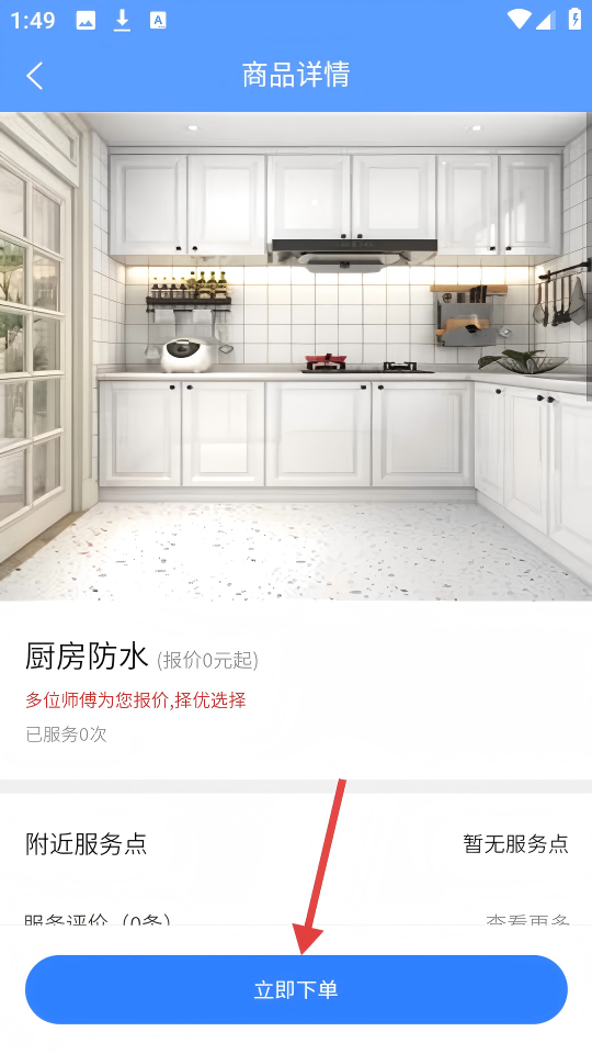 3、在厨房防水商品详情页,查看服务相关信息后,点击【立即下单】按钮。
