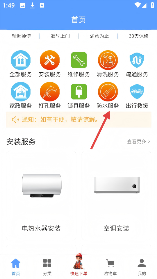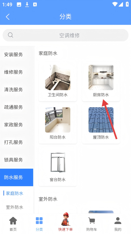 1、、在首页点击【防水服务】图标,进入防水服务分类页面。