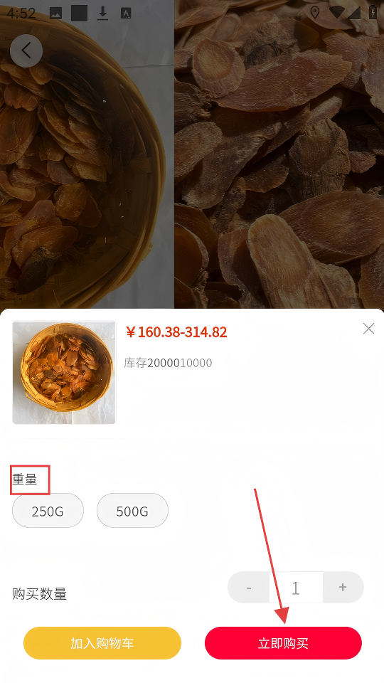 2、在红参商品详情页,点击右下角的【立即购买】,进入规格选择界面。