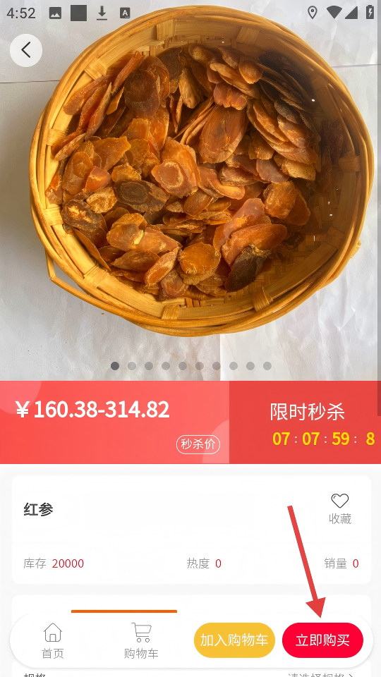 1、点击首页限时秒杀栏目中的【红参】商品,进入该商品详情页。