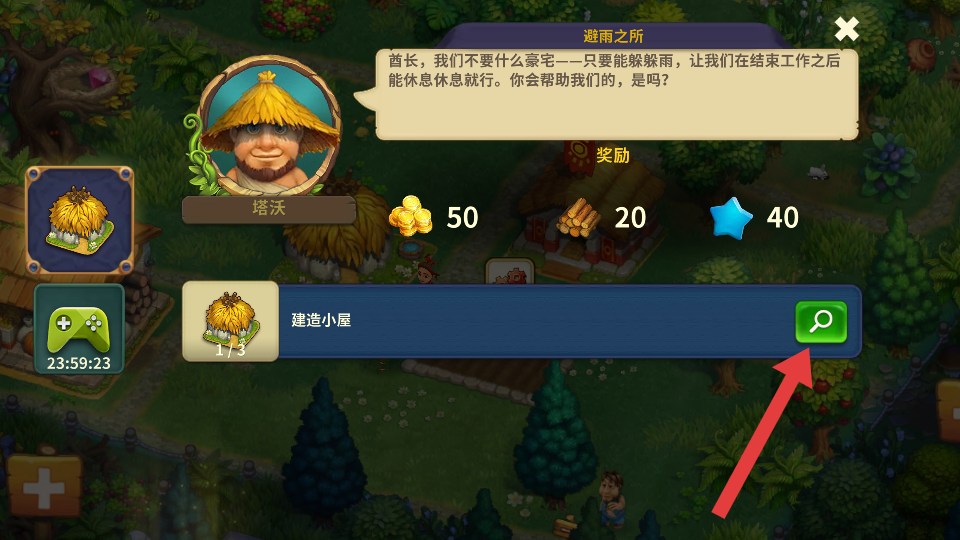 2、在任务界面中,了解【避雨之所】任务详情,点击绿色放大镜按钮,查看建造所需建筑。