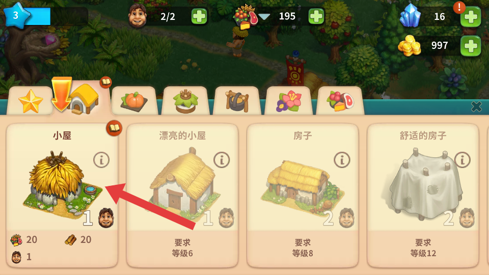 3、在建筑选择界面,找到符合任务要求的【小屋】,确认所需资源为【20】果实、【20】木材和【1】人口后,点击选取。