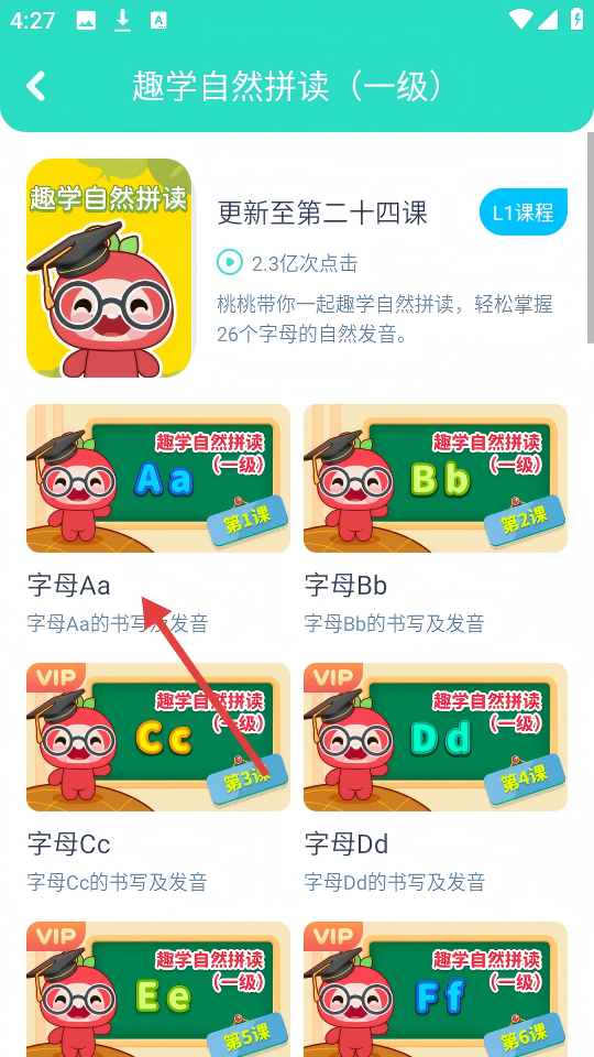 4、在趣学自然拼读(一级)页面,点击【字母Aa】,学习其书写及发音。