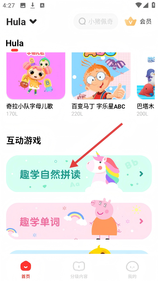 3、在Hula首页,点击【趣学自然拼读】,进入课程页面。