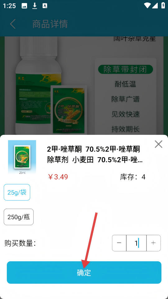 3、选择商品规格(如【25g/袋】)和购买数量后,点击【确定】按钮。