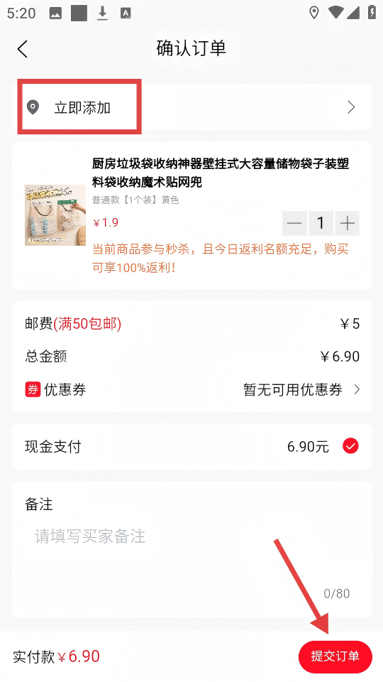 4、在确认订单页面,添加地址点击【立即添加】,之后点击【提交订单】。